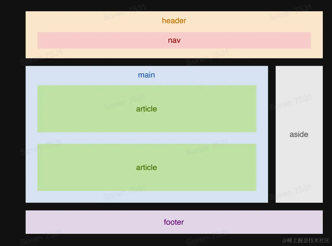大致上,HTML可以分为四个部分:header、main、aside、footer,如下图所示。