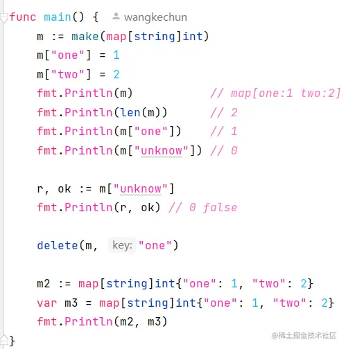 创建完完map之后,我们可以往里面通过[ ]语法去写入k-v对,然后也能通过[ ]去读取k-v对,然后我们通过delete去删除k-v对,在从map里面是读取kv对的时候,我们可以在后面接加一个ok,用来获取这个map里面到底有没有这个k存在。