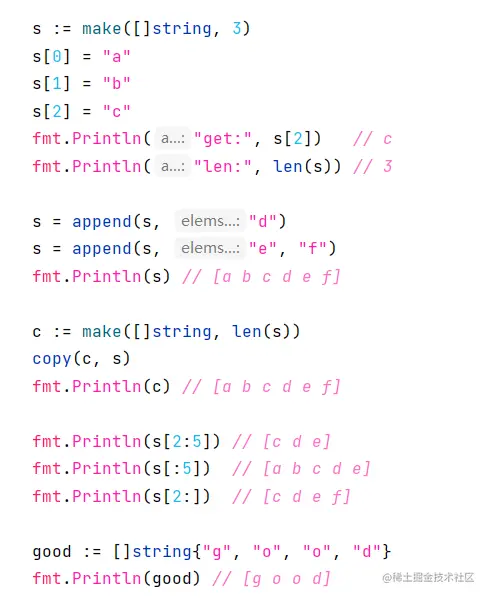切片可以用append去追加元素,这里注意一下append的用法,它必须把append的结果赋值给原数组。因为golang里面slice的原理实际上是存储了一个长度加一个容量,加一个指向数组的指针,在你之前和判断当中的时候,如果容量不够,那么会发生扩容并发的一个新的slice,所以你必须要赋值回去,在妹子来创建的时候也可以直接指定长度,这样就相当于你刚创建完就有对应的长度,你可以用copy在两个slice里面去拷贝数组,莱斯还拥有像Python一样的切片操作,比如这里的话代表我去取出来第二个位置到第五个位置的元素不包括第五个元素,所以输出的是cde。不同,Python这里不支持负数索引,所以你需要len用来取出slice的长度,然后再做一些简单的运算。