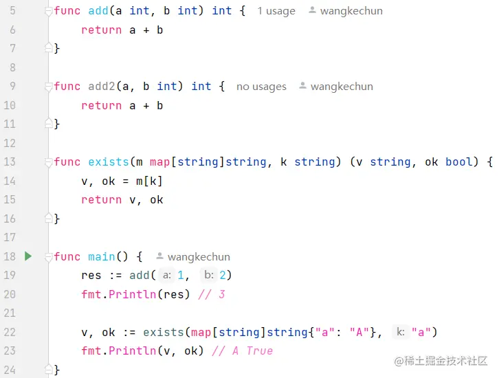 下面我们来看一下里面的函数,先看第五行到第七行代码,这是golang里面一个最简单的实现两个变量相加的函数,golang里面和进了很多语言不一样的是变量类型是后置的,golang里面的函数是原生支持返回多个值,但实际的业务逻辑代码里面几乎所有的函数都返回多个值,第一个值是真正的返回结果,第二个值是错误信息,参考第13到第16行代码这里的话,这个函数会返回两个值,一个值是真正的value,第二个是返回ok,就是是否存在。