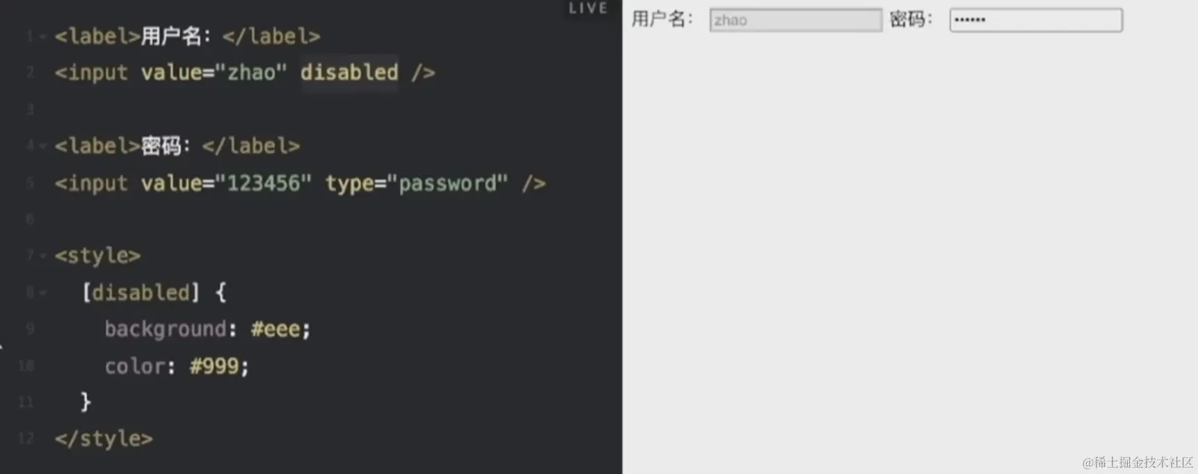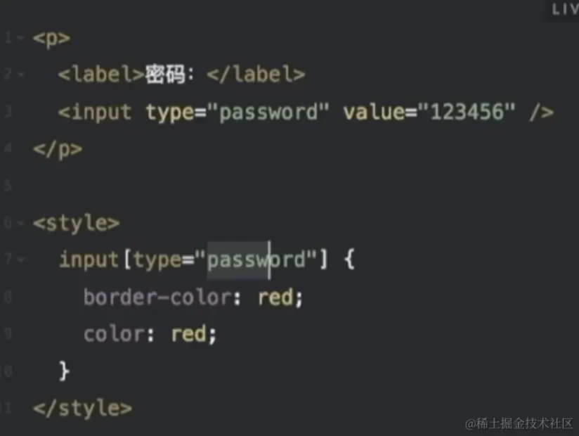 - 属性选择器:通过该元素某些属性或属性值去选中该元素,使用:[属性],下图例子中是给input标签的disabled属性设置样式(给禁用的输入框设置样式)