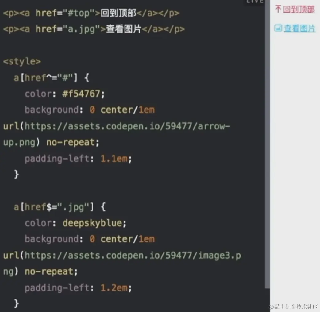 - 同样也可以按照规则去进行属性值的匹配(例如下面的^=表示以什么为开始,$=表示以什么为结尾)