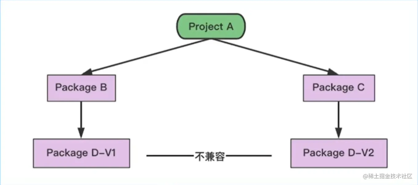 通过每一个项目引入一份依赖的副本,解决了多个项目需要同一个 package 依赖的冲突问题