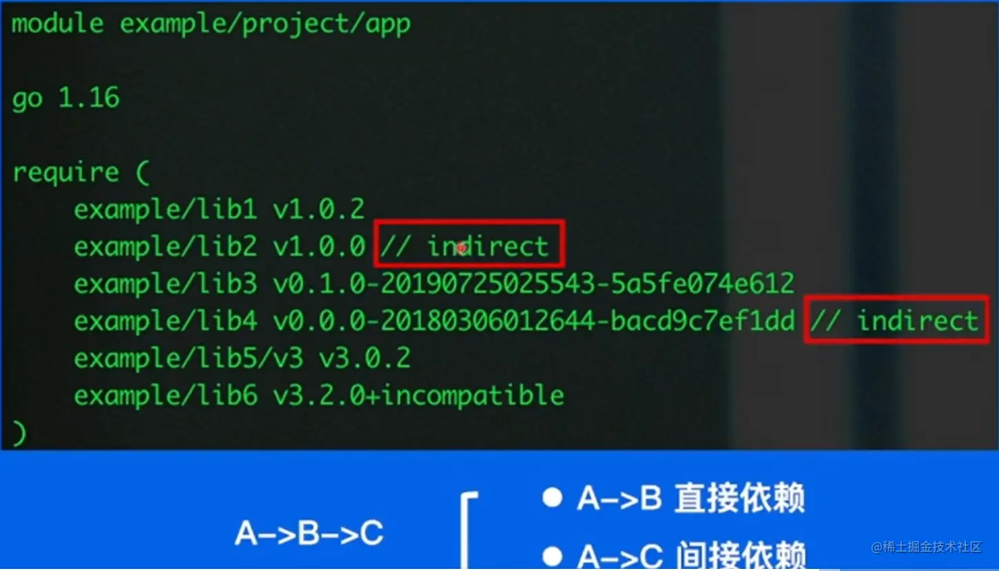Go module 中对于没有直接导入的模块都会标识为非直接依赖,用indirect标识出来