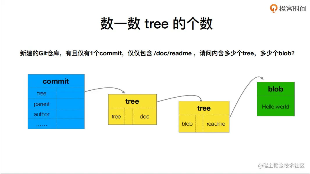 注意,一个commit里的tree和parent实际都是以当前工作目录作为树的起始点,所以下面这里是有两个tree的,工作根目录一个,doc一个。