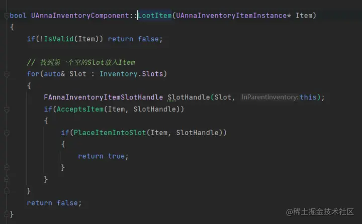AcceptsItem函数的功能为判断指定的插槽Item Instance指针是否为空,如果为空则返回true,说明可以放入新的物品
