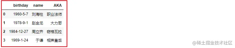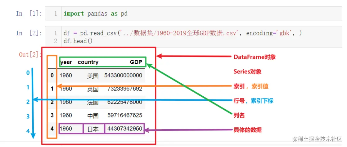 上图为上一节中读取并展示出来的数据,以此为例我们来讲解Pandas的核心概念,以及这些概念的层级关系: