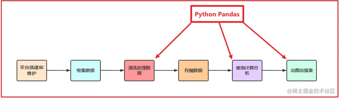 - 在大数据场景下,数据在流转的过程中,Python Pandas丰富的API能够更加灵活、快速的对数据进行清洗和处理
