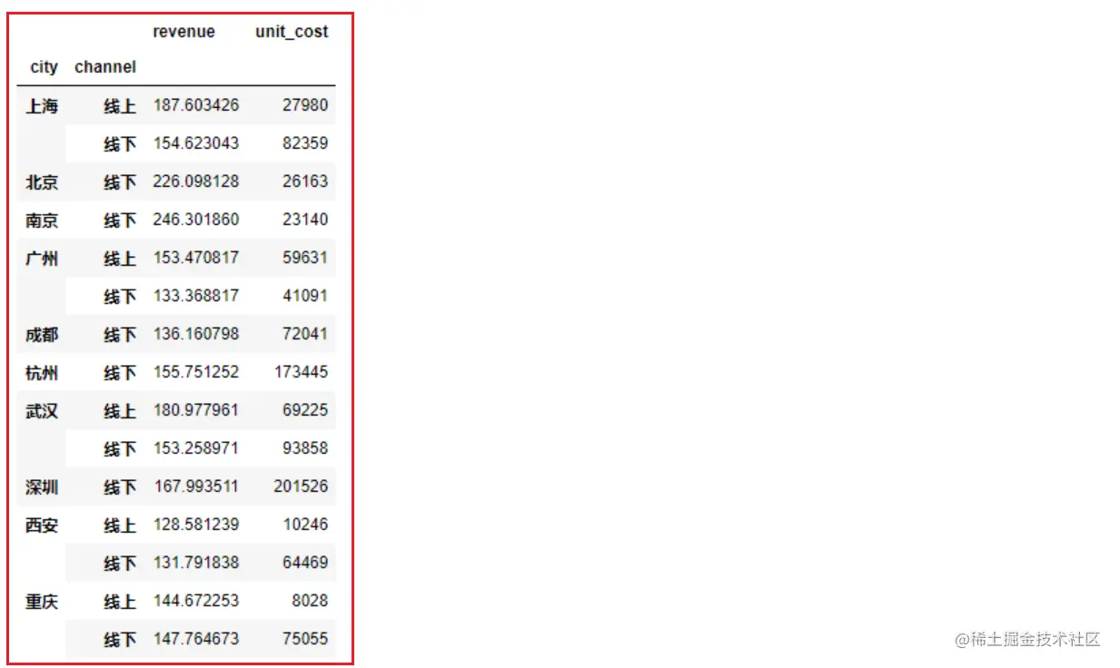 - 按城市和线上线下划分,分别计算销售金额的平均值、成本的总和