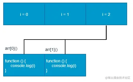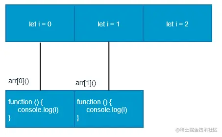 经典面试题图解:此题的关键点在于每次循环都会产生一个块级作用域,每个块级作用域中的变量都是不同的,函数执行时输出的是自己上一级(循环产生的块级作用域)作用域下的i值.