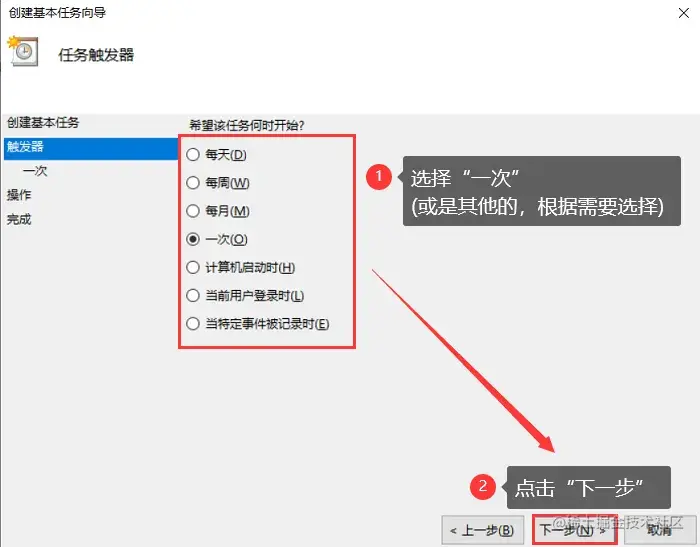 步骤4: 在【希望任务何时开始】这里,选择你需要设置的时间,比如【一次】,单击【下一步】;