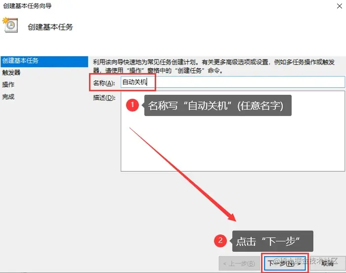 步骤3: 在【名称】的输入框里,输入【自动关机】(也可以输入其他的任意名称),单击【下一步】;