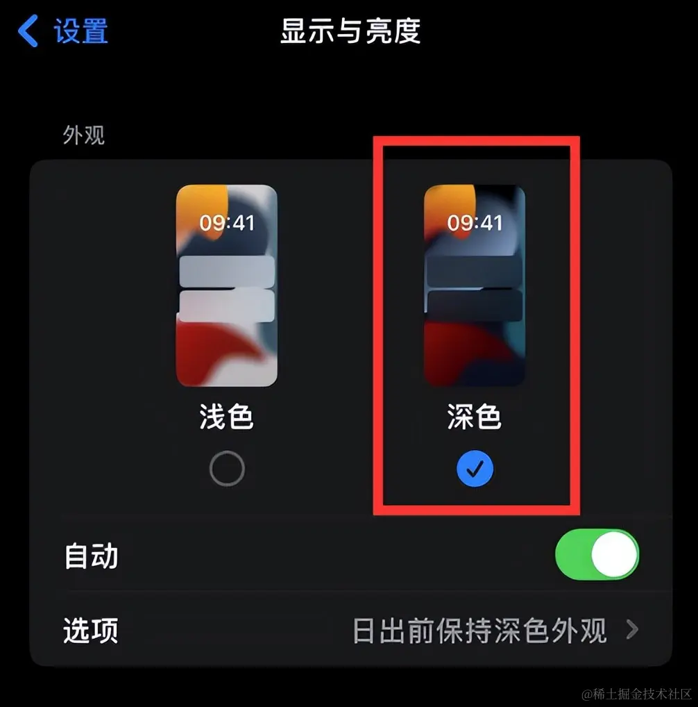 **步骤2:**进入【显示与亮度】的界面之后,选择右侧的【深色】即可打开iPhone的夜间模式。