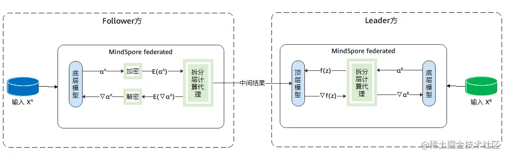 - 拥有属性的参与方(Follower方)都会持有一个底层网络,参与方属性输入底层网络得到中间结果,再将中间结果发送给拥有标签的参与方(Leader方)。