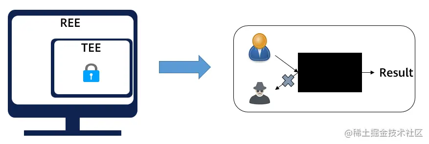 作为隐私计算的重要分支,机密计算是一种利用硬件可信执行环境 (TrustedExecution Environment, TEE) 保护使用中数据的技术[1]。如下图所示,在非安全世界(Rich Execution Environment,REE)中,基于硬件隔离出的 TEE环境就像是一个黑盒子,可防止外部(包括操作系统、特权用户、恶意程序等)对TEE内使用中的应用程序和数据进行未经授权的访问或篡改,从而实现数据在第三方平台的“可用而不可见”,消除数据上云的安全顾虑,推动数据安全流通。