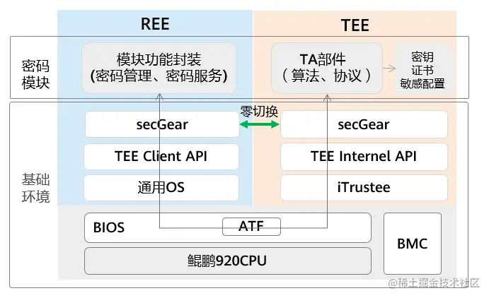 - 管理服务:运行在 REE 侧,负责对外提供密码服务,转发请求到 TEE中处理。