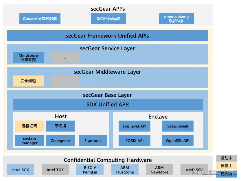 - Base Layer:机密计算 SDK 统一层,屏蔽 TEE 及 SDK差异,实现不同架构共源码。