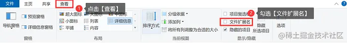 **步骤2:**点击上方菜单栏的【查看】,接着将【文件扩展名】勾选,这样你就能看到文件的后缀名了!