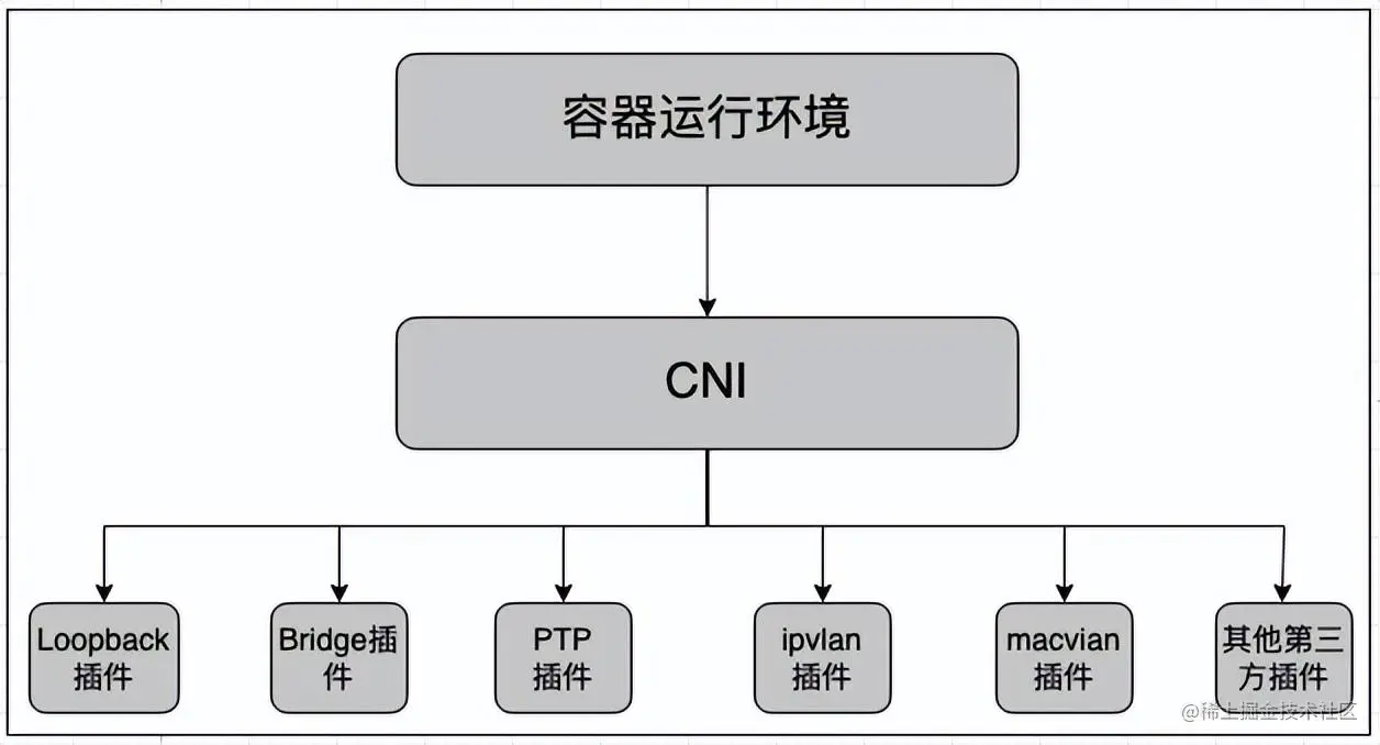 CNI(Container Network Interface)是CNCF基金会下的一个项目,由一组用于配置容器的网络接口的规范和库组成,它定义的是容器运行环境与网络插件之间的接口规范,仅关心容器创建时的网络配置和容器被销毁是网络资源的释放,并且一个容器可以绑定多个CNI网络插件加入网络中,如下图。