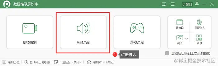 打开数据蛙录屏软件,进入主界面后,点击中间的【音频录制】。