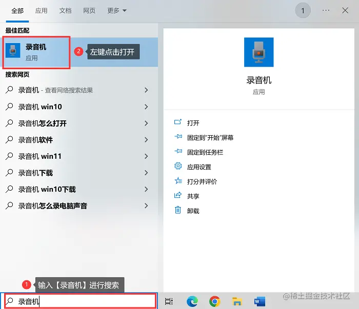 使用方法也很简单,只需要在电脑的桌面的左下角的搜索框中,输入【录音机】进行搜索,接着左键点击上方的【录音机】应用,打开即可开始录音。