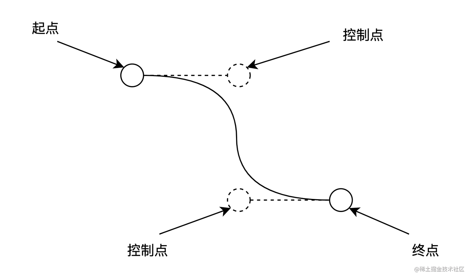 根据 edge 组件的入参起点坐标 start 和终点坐标 end,计算出中点,从而计算出两个贝塞尔控制点,通过这四个坐标可以绘制出一条圆滑的贝塞尔曲线。