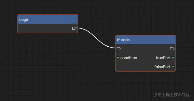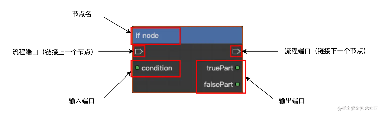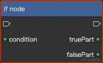 输出端口:类似于函数的返回值,可以将输出端口连接到其他节点的输入端口。输出端口也可以用作流程端口,通常出现在流程控制节点上,用于处理多逻辑分支。比如 if 节点,可以有两个分支,truePart 和 falsePart,truePart连接到条件为真的流程的首个节点,同理,falsePart 连接到条件为假的流程的首个节点。