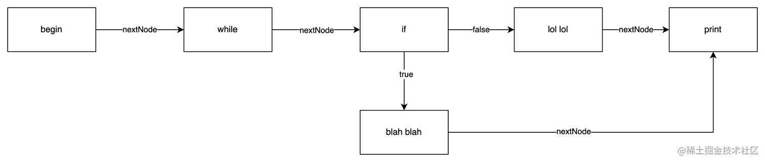 - 开始编译 begin 节点,获取 begin 节点指向的下一个节点,开始编译下一个节点,并把编译后的 AST 节点关联到 begin AST 节点的 nextNode 字段