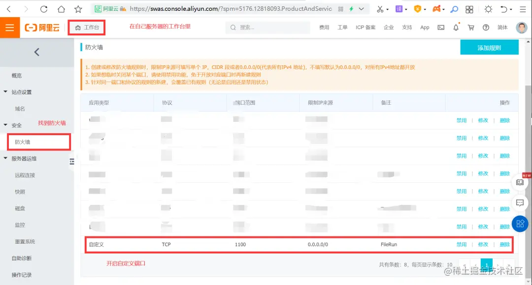 用阿里云服务器配置还需要注意一个小细节点,记得开启防火墙的自定义端口