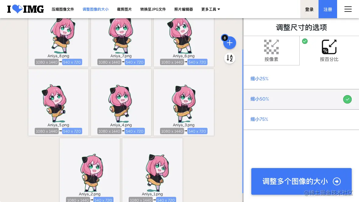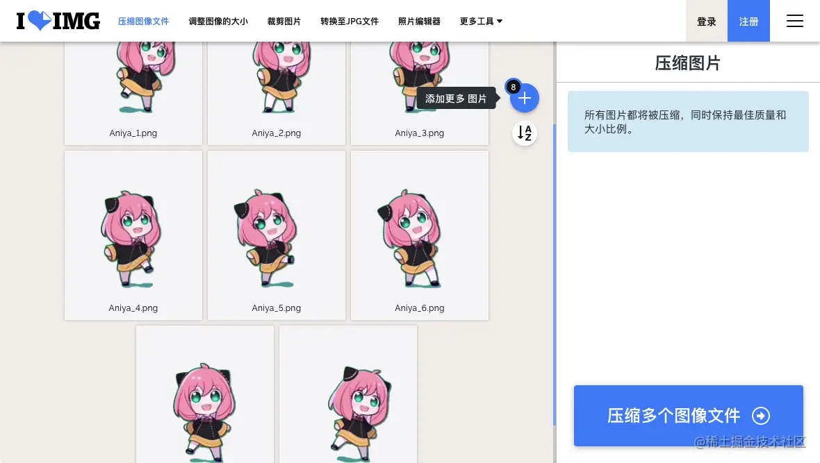 此时我发现每张图片都太大了,高1080去了,足足有680多kB,我先将每张图片抠出阿尼亚,透明背景,因为都是纯色背景,还是很好抠图的(ps擅长者忽略),然后对图片进行等比例缩小,然后压缩,这里用到的网站是I❤️IMG,操作如下: