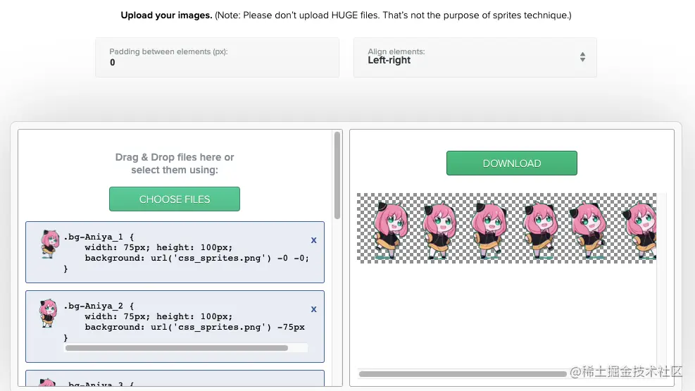 看你需要,其实每张图片调整大小能弄到每张很小很小,,不过我希望清晰一点呢,(像素风的Aniya好像也不错),然后合成一张sprites图,这里我用的这个CSS Sprites Generator网站,操作还是比较方便的。