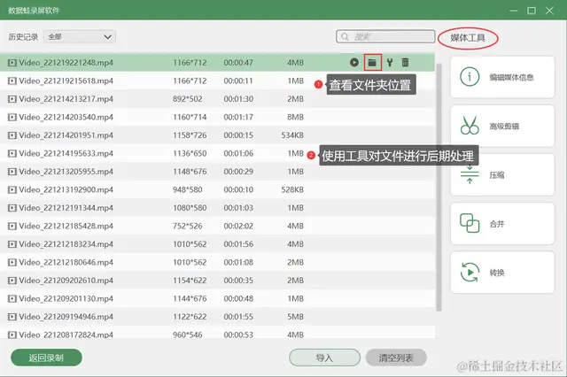 **步骤4.**点击【完成】按钮之后,会进入到【录制历史】页面,在此页面,您可以看到以往的录屏文件,还可以点击文件右侧的【文件夹】图标,查看文件位置,还可以使用右侧的【媒体工具】对文件进行后期处理,包括压缩、合并、转换等。
