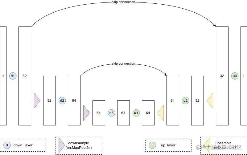 一些 UNet 的设计在每个阶段都有复杂的 blocks,但对于这个玩具 demo,我们只会构建一个最简单的示例,它接收一个单通道图像,并通过下行路径上的三个卷积层(图和代码中的 down_layers)和上行路径上的 3 个卷积层,在下行和上行层之间具有残差连接。我们将使用 max pooling 进行下采样和 nn.Upsample 用于上采样。某些比较复杂的 UNets 的设计会使用带有可学习参数的上采样和下采样 layer。下面的结构图大致展示了每个 layer 的输出通道数: