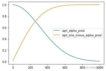 数学符号看起来总是很吓人!幸运的是,调度器为我们处理了所有这些(取消下一个单元格的注释以检查代码)。我们可以画出 (标记为 sqrt_alpha_prod) 和 (标记为 sqrt_one_minus_alpha_prod) 来看一下输入 (x) 与噪声是如何在不同迭代周期中量化和叠加的 :