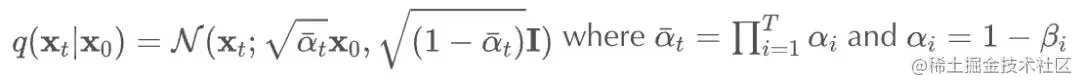 这就是说,我们取 , 给他一个 的系数,然后加上带有 系数的噪声。这里 是根据一些管理器来为每一个 t 设定的,来决定每一个迭代周期中添加多少噪声。现在,我们不想把这个推演进行 500 次来得到 ,所以我们用另一个公式来根据给出的 计算得到任意 t 时刻的 :