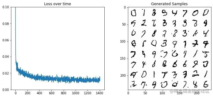我们可以用这个模型代替原来的模型来重复一遍上面展示的训练过程。我们需要将 x 和 timestep 传递给模型(这里我会传递 t = 0,以表明它在没有 timestep 条件的情况下工作,并保持采样代码简单,但您也可以尝试输入 (amount*1000),使 timestep 与噪声水平相当)。如果要检查代码,更改的行将显示为“#<<<。
