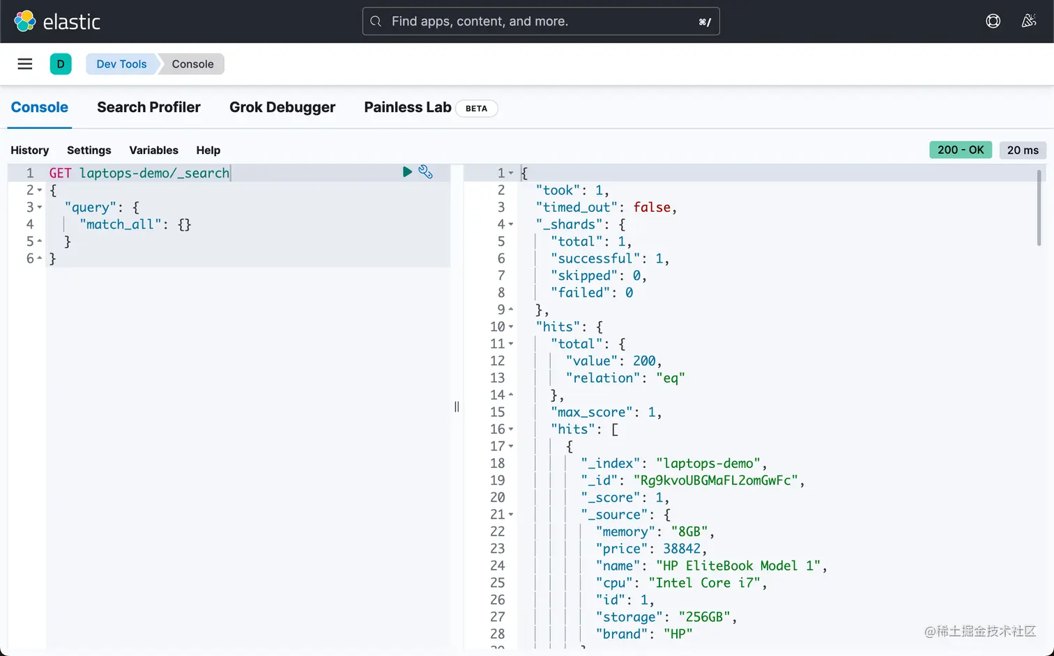 Elasticsearch 是业界最流行的开源企业搜索引擎,应用广泛。 在我们的手机里的 App 背后的搜索引擎好多都是 Elasticsearch,比如我们熟知的抖音,滴滴,美团,携程,点评,银行 app,保险,证券,交友,健康宝等等。如果你想初步了解 Elasticsearch,请阅读我之前的文章 “Elasticsearch 简介”。 我们还学习了如何在 Python 中使用 Elasticsearch。 索引 laptops-demo 已创建并填充了一些示例数据,本文中的查询将基于这些数据。 如果你还没有读过这篇文章,建议先读一读。 但是,如你已经对 Elasticsearch 有所了解,则可以毫无问题地继续阅读本文。