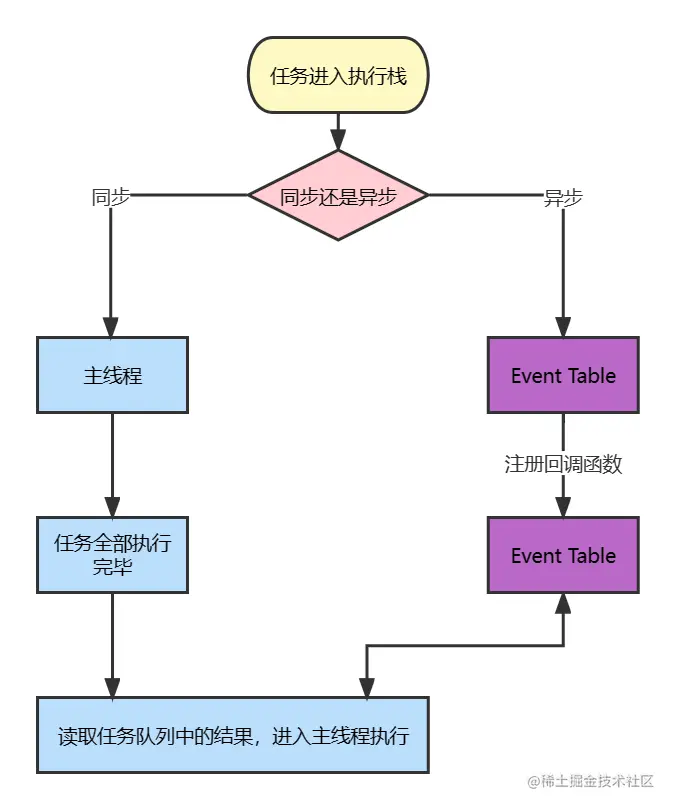 - 同步和异步任务分别进入不同的执行"场所",同步的进入主线程,异步的进入Event Table并注册函数