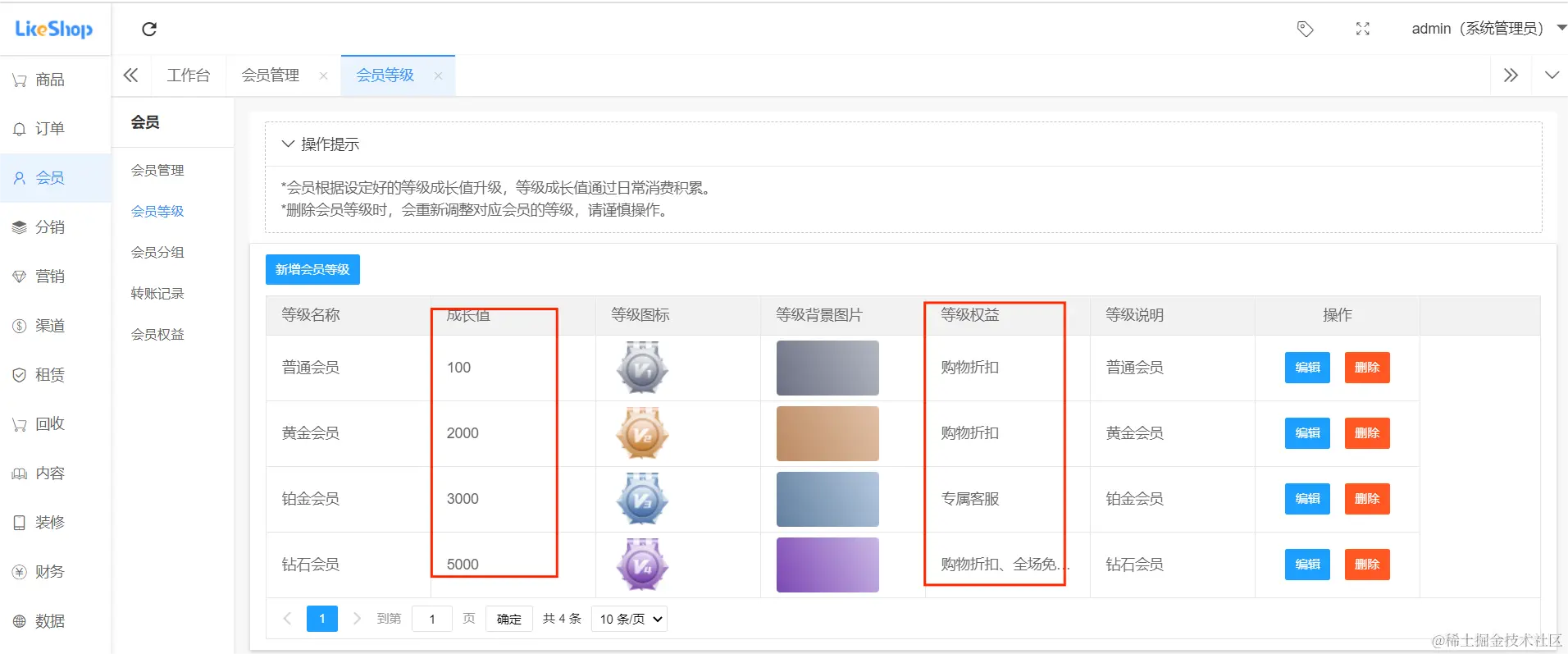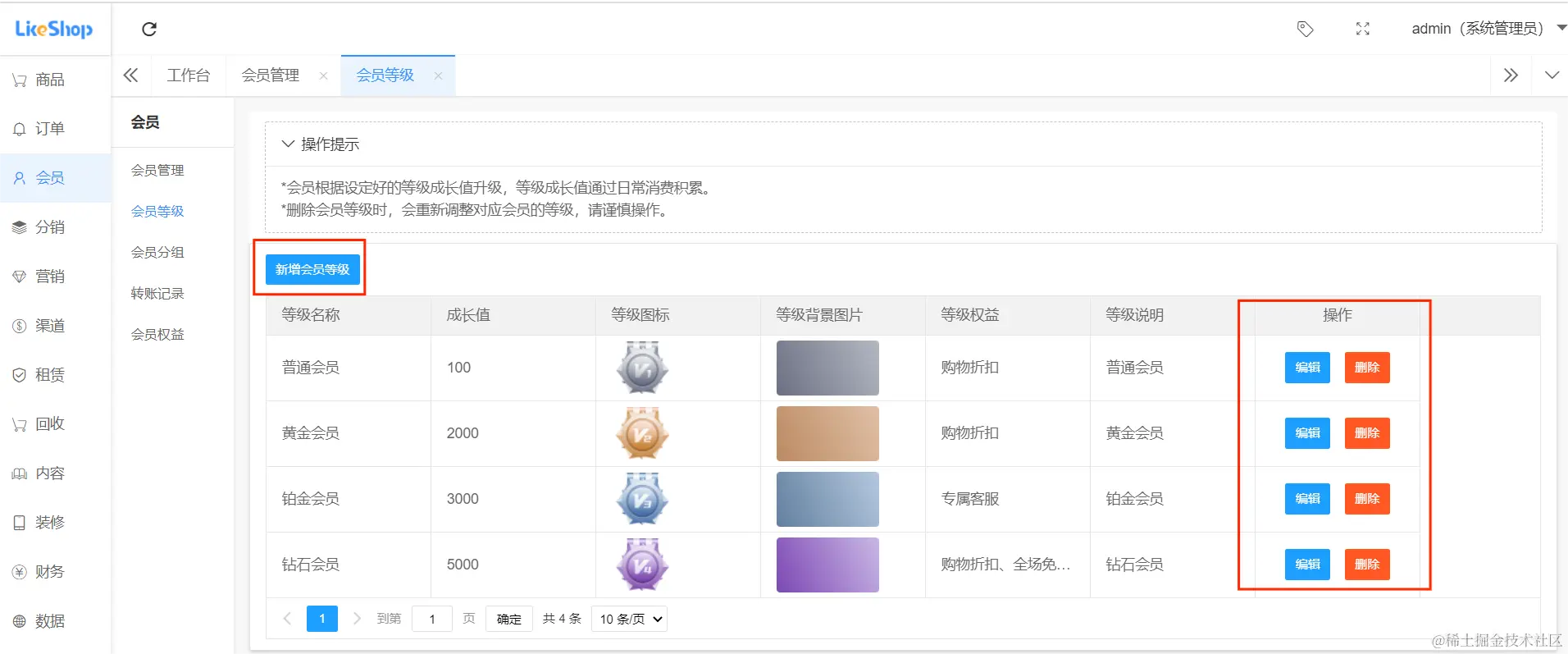 可以进行编辑/删除等操作,删除会员等级时,会重新调整对应会员的等级,如下图所示: