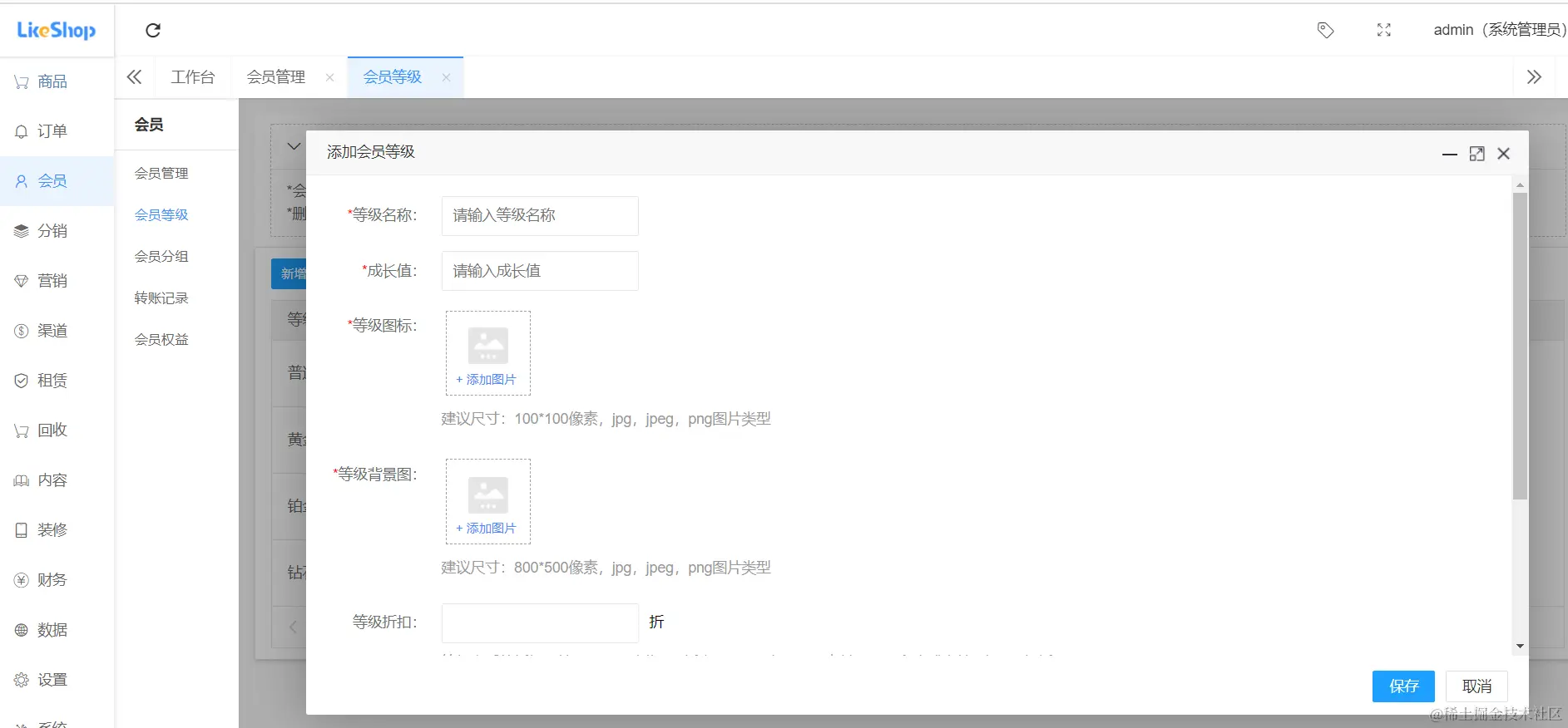 会员等级—新增会员等级:需输入等级名称、成长值、等级图标、等级背景图、等级折扣、等级权益、等级说明等,如下图所示: