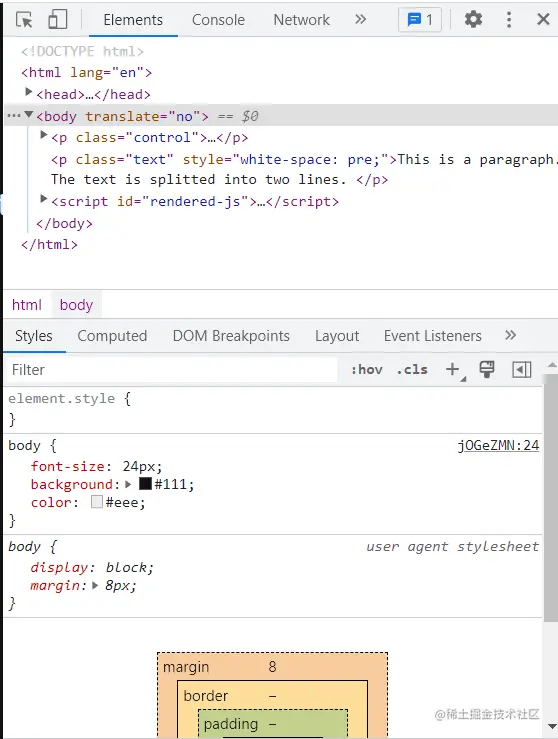 上半部分为html元素,选中一个元素,下半部分为对应的样式,即可调试