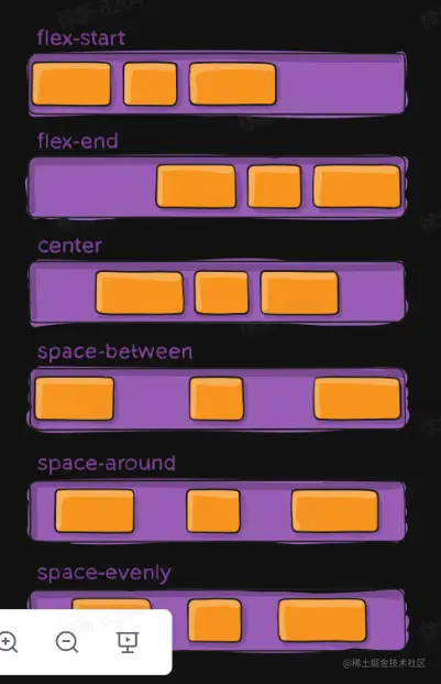 - flex-grow: 有剩余空间时的伸展能力,比如容器宽为900px,其中3个子元素width设置为200px,伸展能力分别为2、1、0,那么最终3个元素宽为400px、300px、200px。因为减掉200 * 3,容器还剩300px,这部分就按照2:1:0分给3个子元素