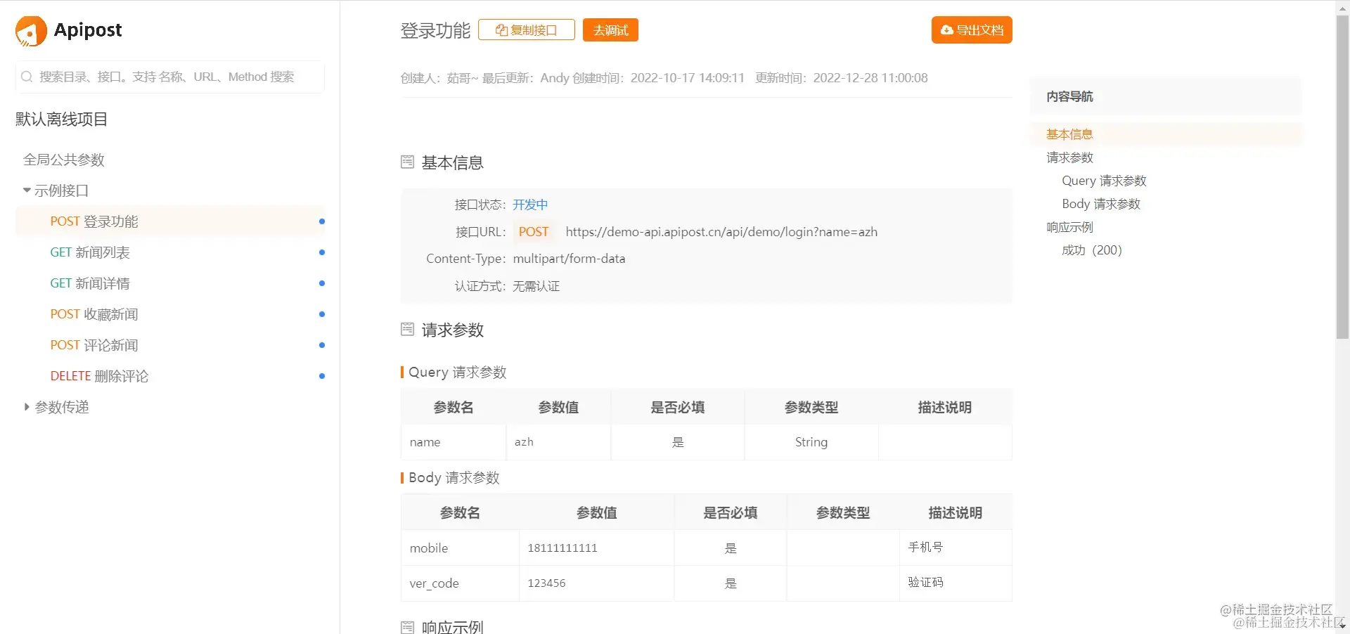 而分享出去的接口文档也很清晰,各种信息一目了然,还设置了目录,能快速定位到想看的接口在什么位置。同时支持导出HTML、markdown、word等格式,满足了常见的使用需求。