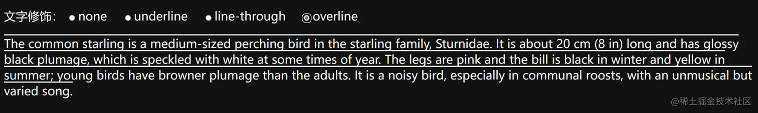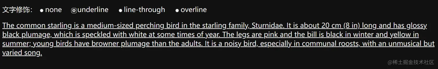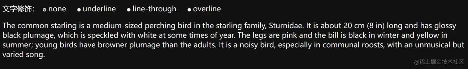 这个 CSS 属性是用于设置文本的修饰线外观的(下划线、上划线、贯穿线/删除线 或 闪烁)它是 text-decoration-line, text-decoration-color, text-decoration-style, 和新出现的 text-decoration-thickness 属性的缩写。