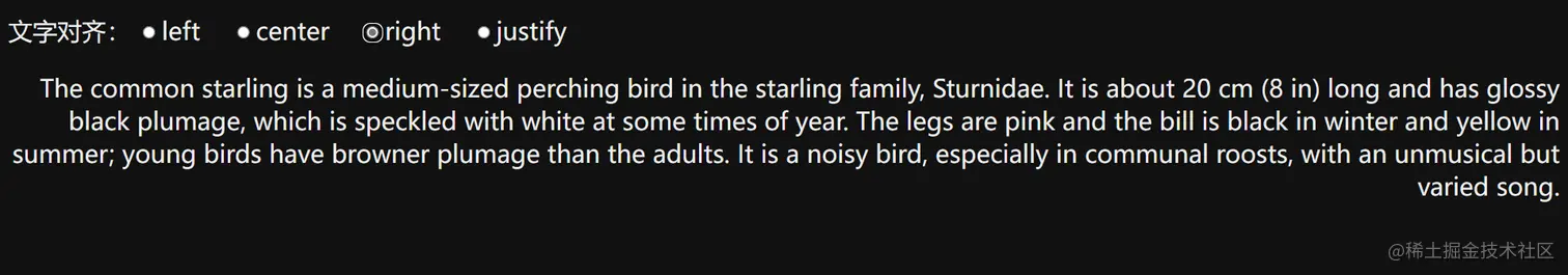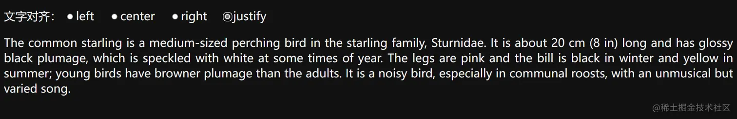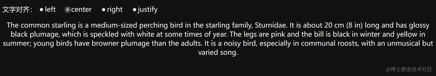 CSS属性定义行内内容(例如文字)如何相对它的块父元素对齐。text-align 并不控制块元素自己的对齐,只控制它的行内内容的对齐。