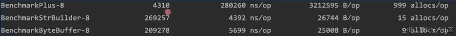 对于strings.Builder和bytes.Buffer这两种方式,也存在区别,从上图可以看出strings.Builder是更快的,从下面strings.Builder和bytes.Buffer的String()函数源码可以看出一点原因。