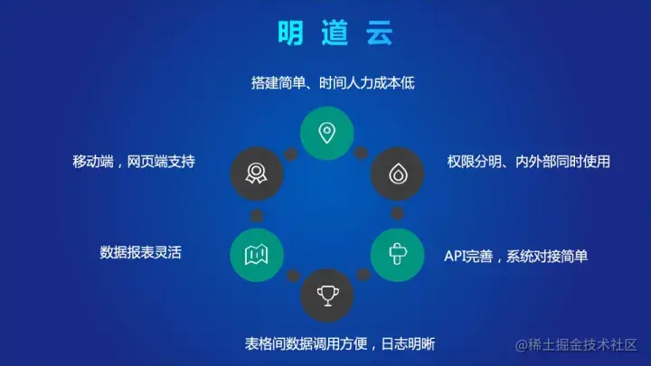 经过很多的数据对比和工具分析,我们发现明道云的应用搭建时间和人力成本是最低的。它的权限非常分明,对外部和内部的使用都非常灵活。同时它的API很完善,对接也非常简单的,能够支持我们后续进行数据拓展。