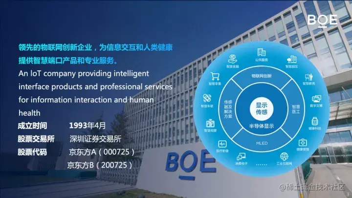 在分享之前,我首先给各位介绍一下我们公司。京东方集团是1993年4月成立的,以半导体显示为核心技术,在物联网创新传感器、智慧医工和Mini/Micro LED上面做创新突破的一家物联网企业。