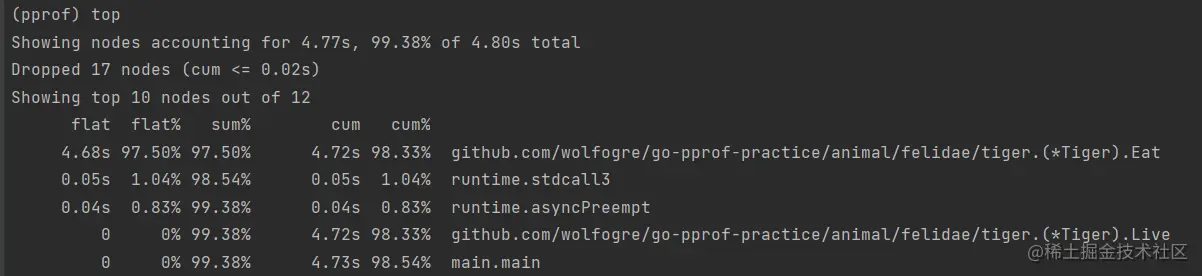 通过top命令查看性能瓶颈,之后可通过list Eat列出具体执行函数的性能消耗
