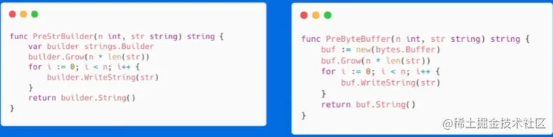字符串拼接不建议使用直接加,byte.Buffer更好。字符串是不可变类型,占用内存大小固定,每次使用+会重新分配内存,strings.Builder,bytes.Buffer底层是[]byte数组。如果增加预分配代码性能会更好。